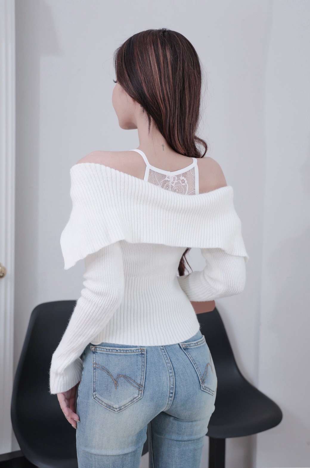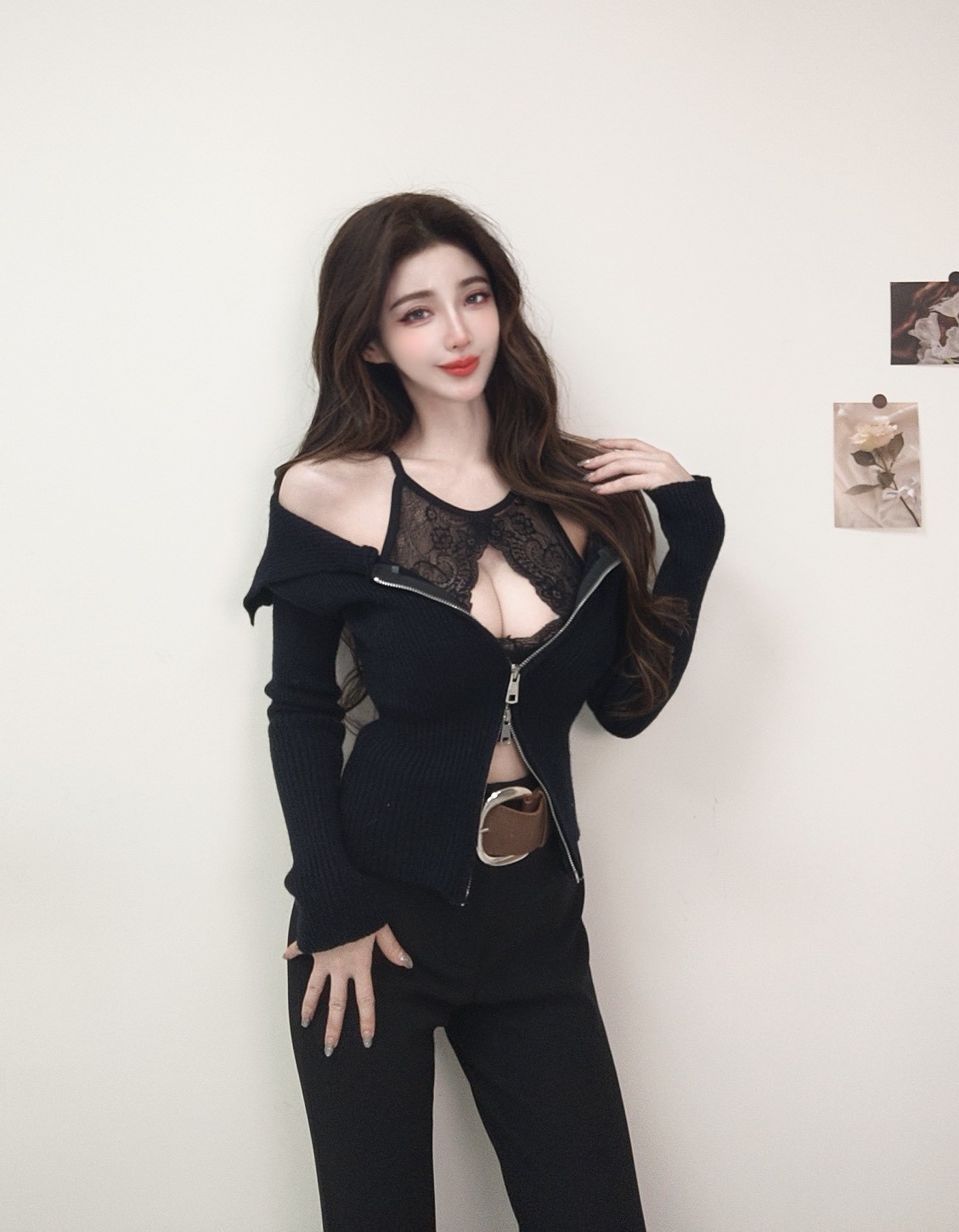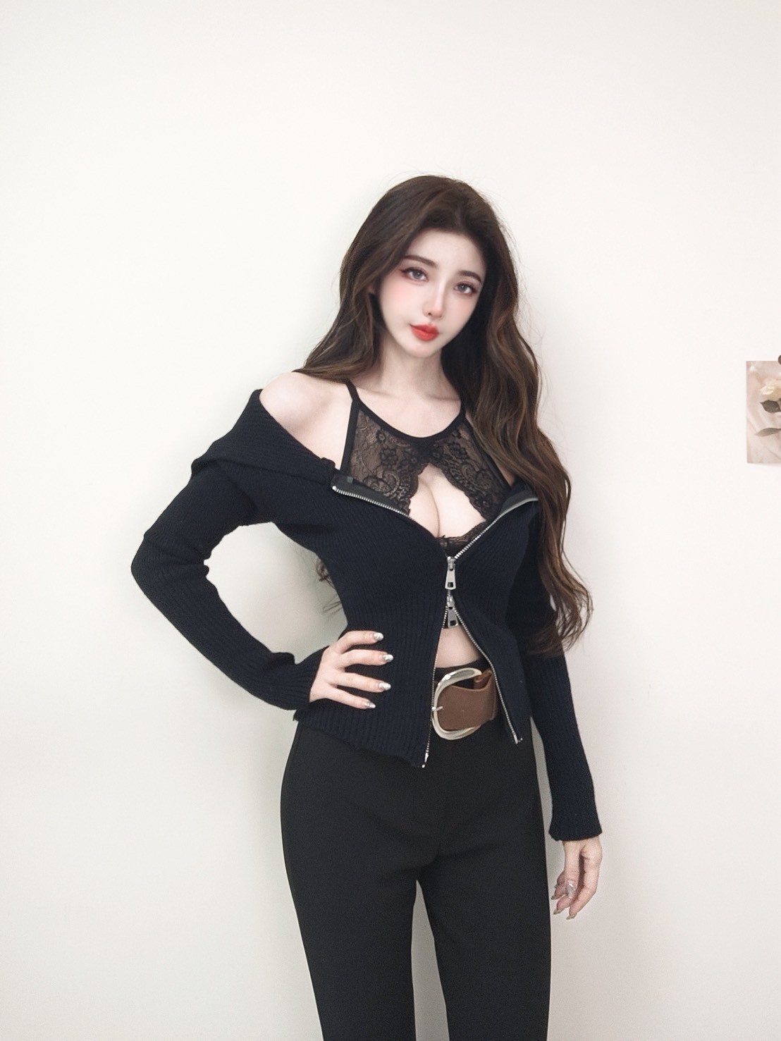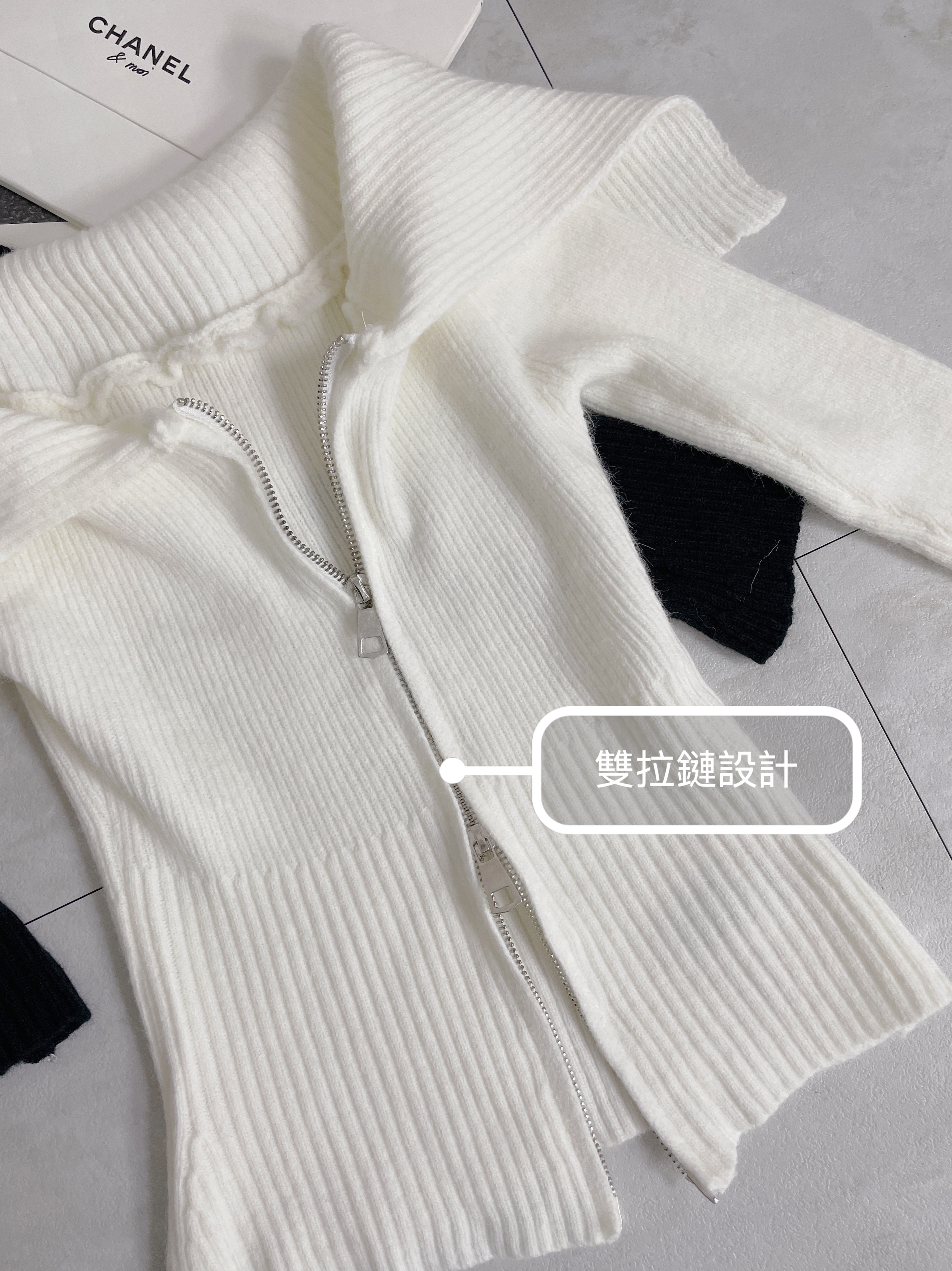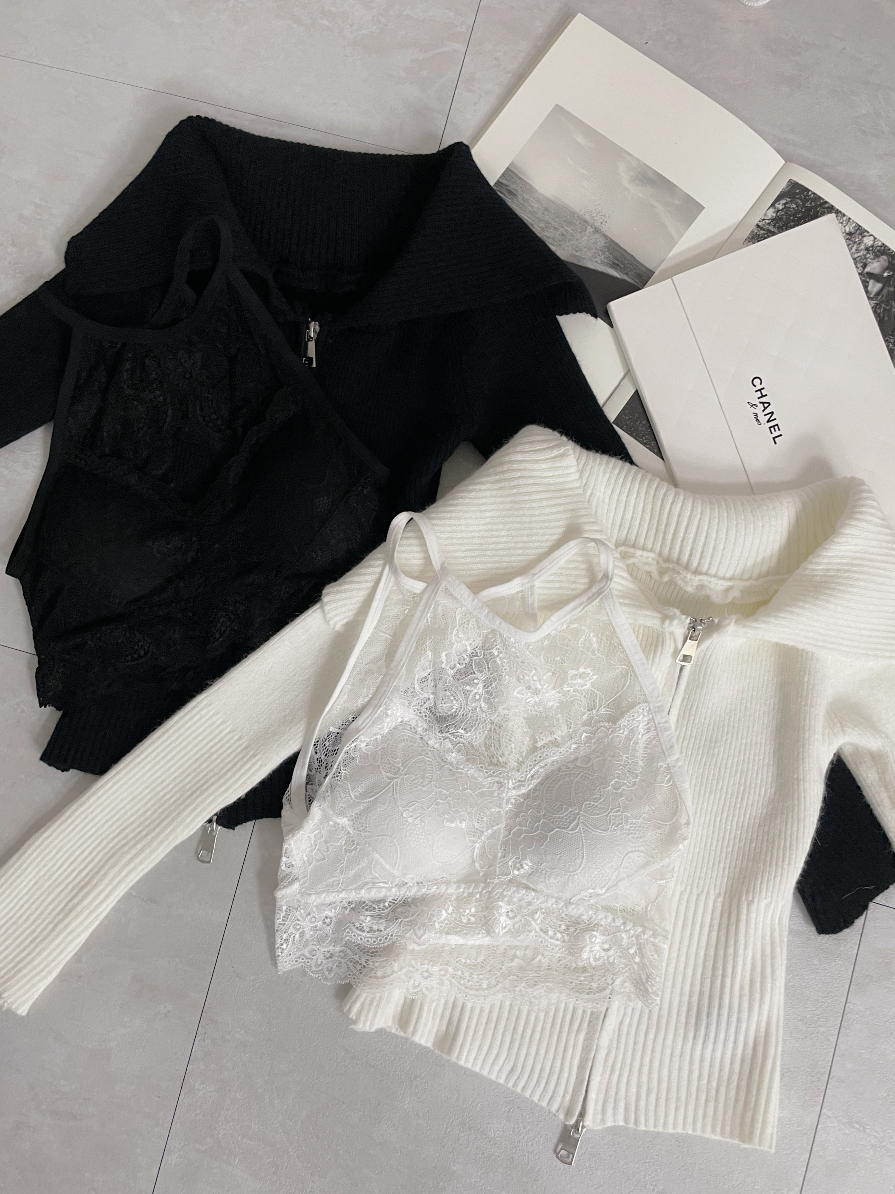 【SET】蕾絲背心+翻領針織雙拉鏈外套