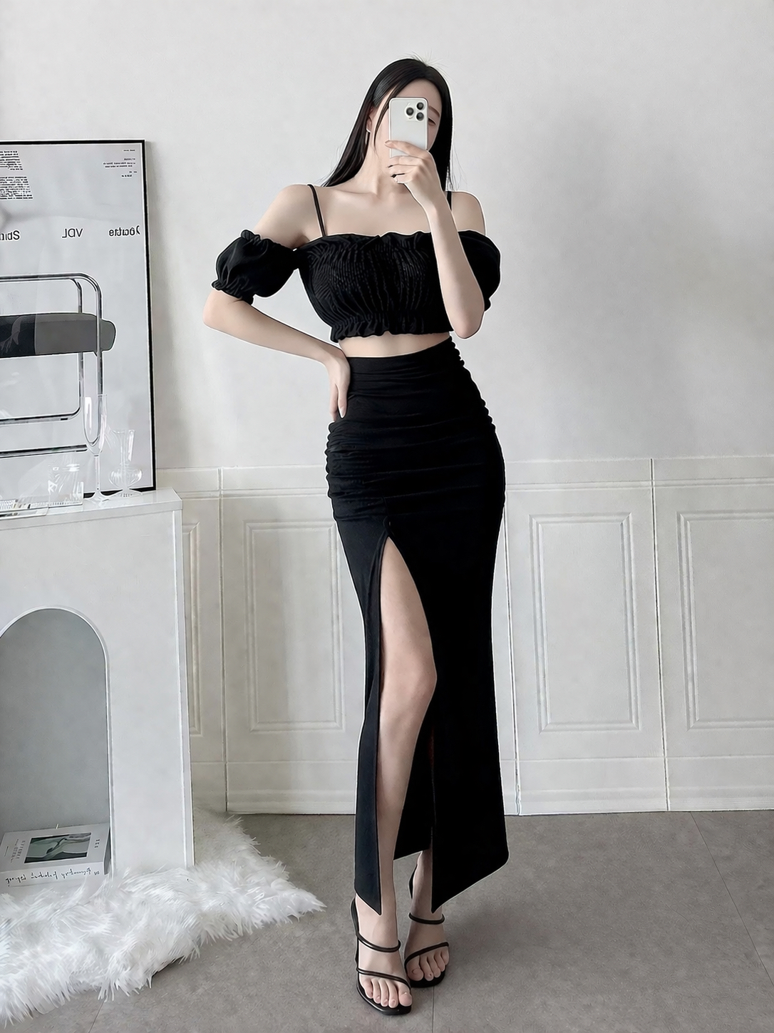 【SET】雲朵之花 花苞壓紋上衣+側抓皺開衩長裙(袖可拆)
