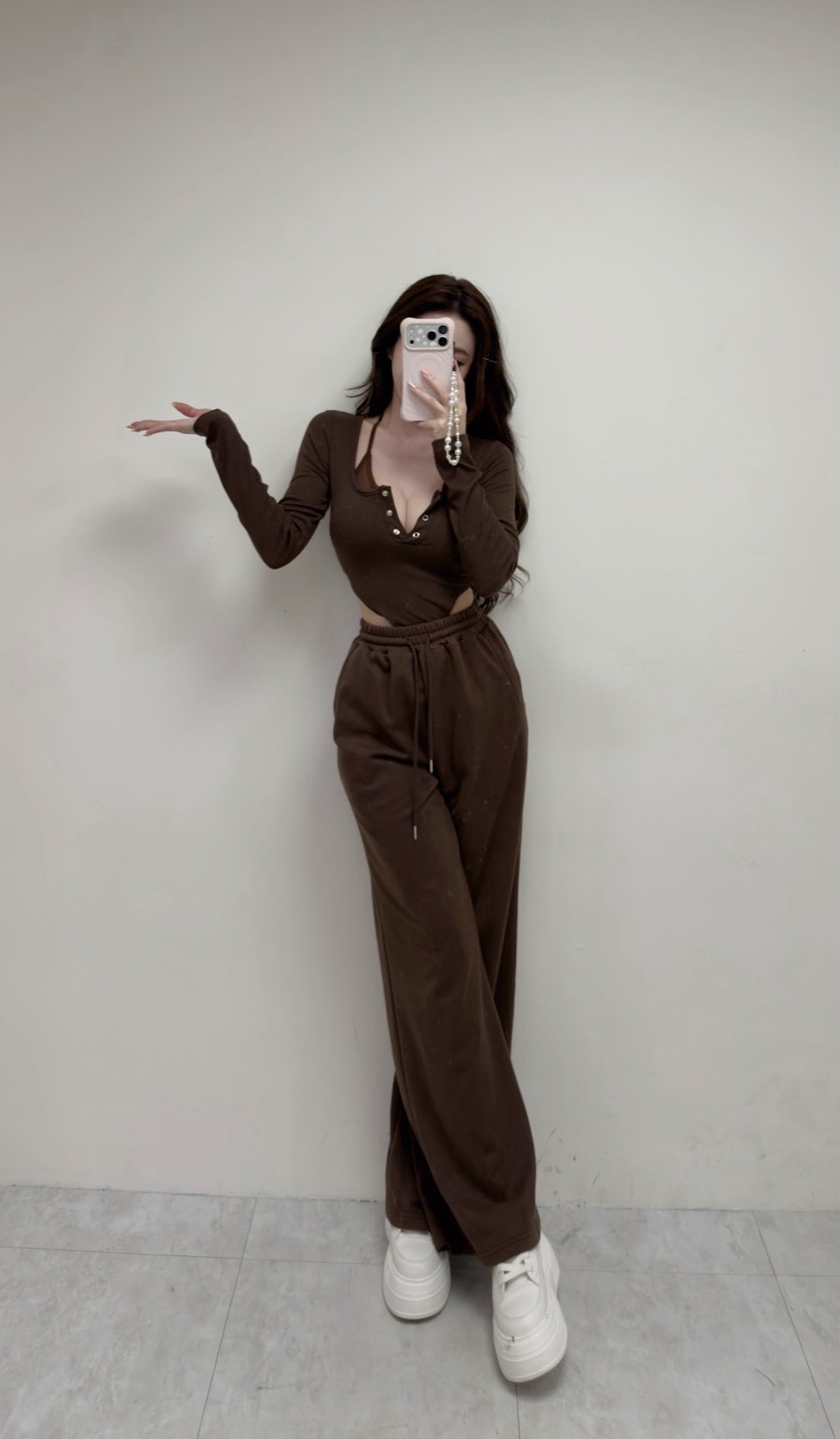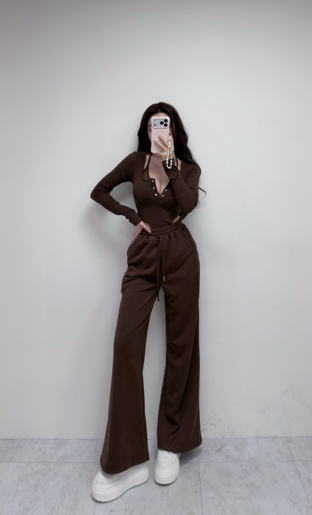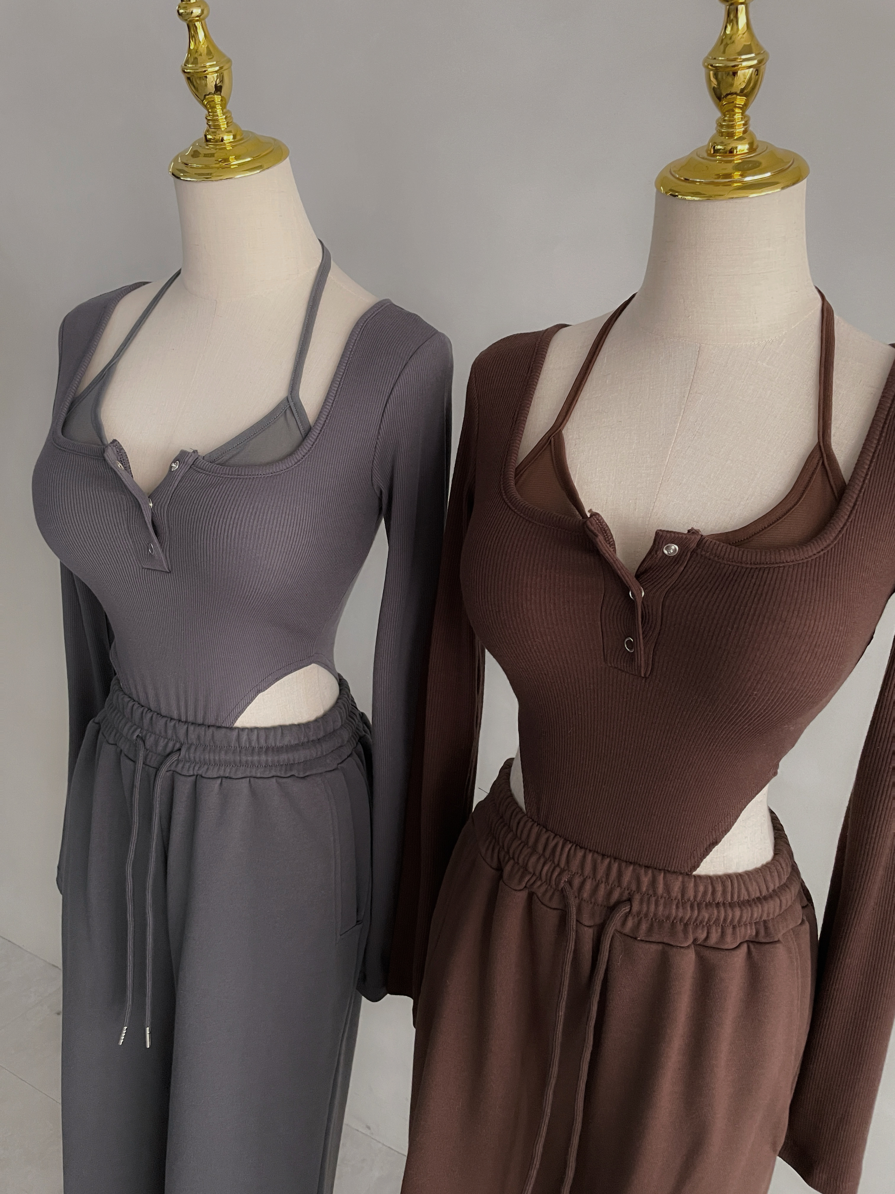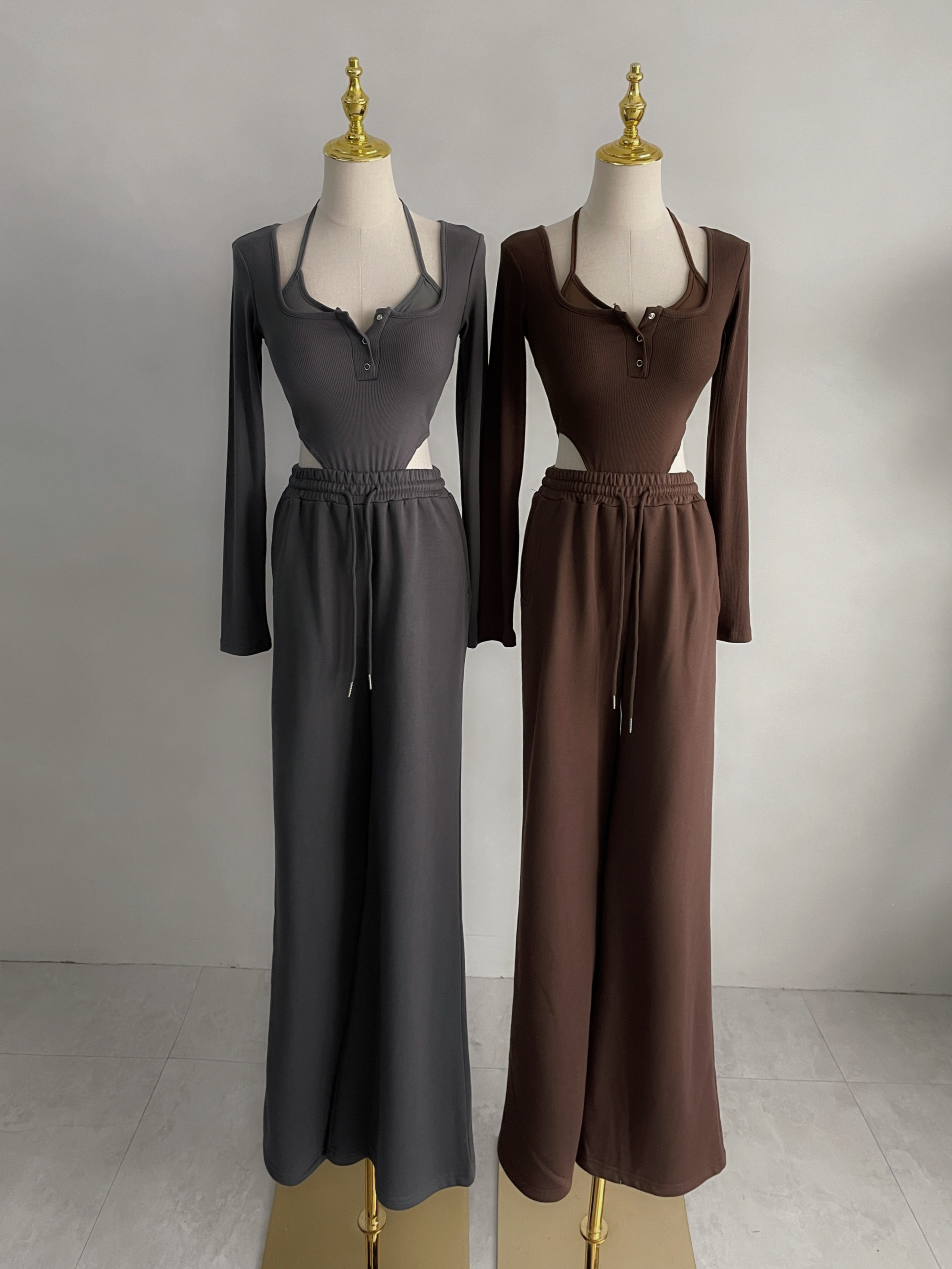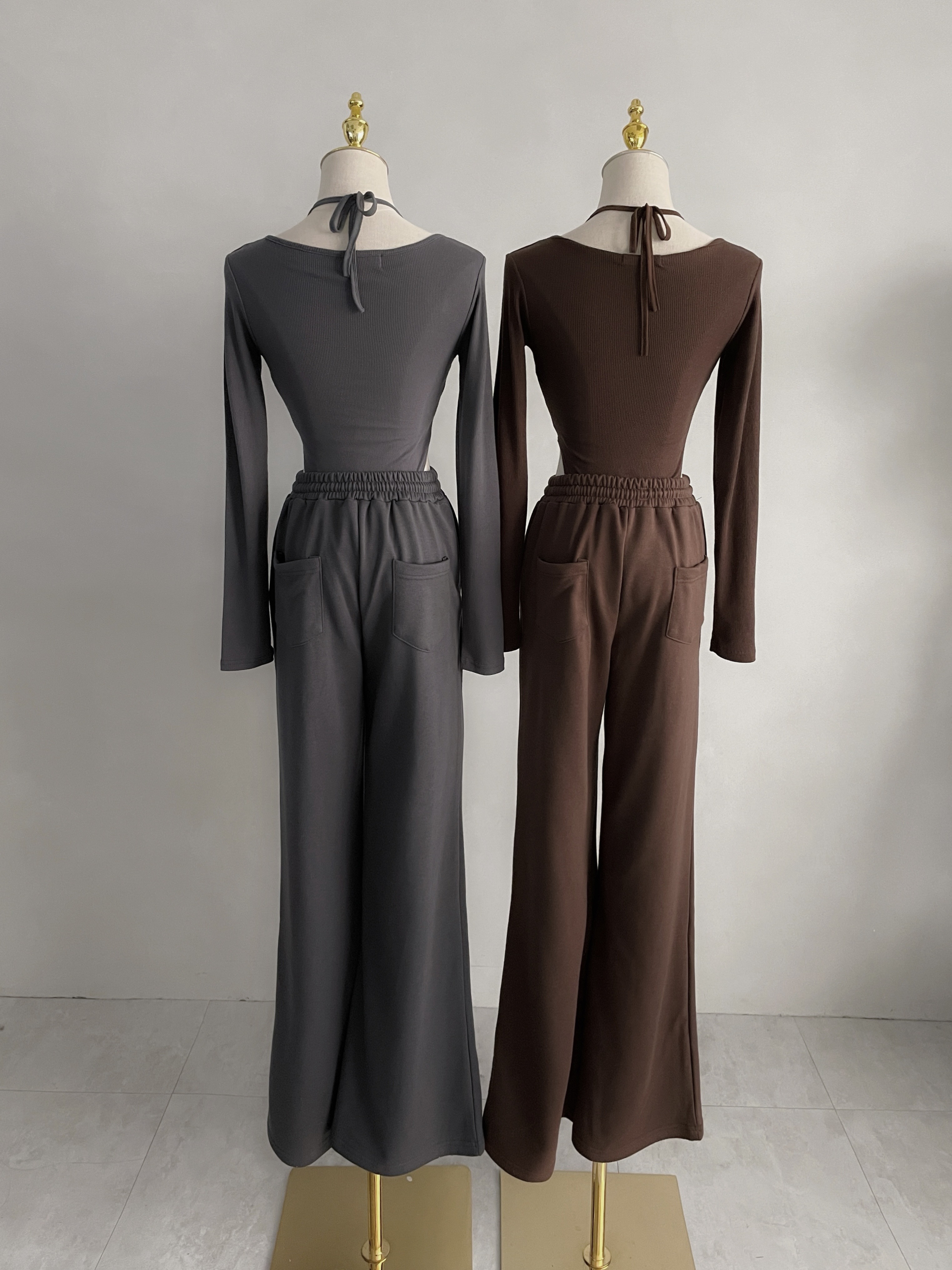 【SET】韓國假兩件透紗綁帶羅紋連體上衣+寬褲