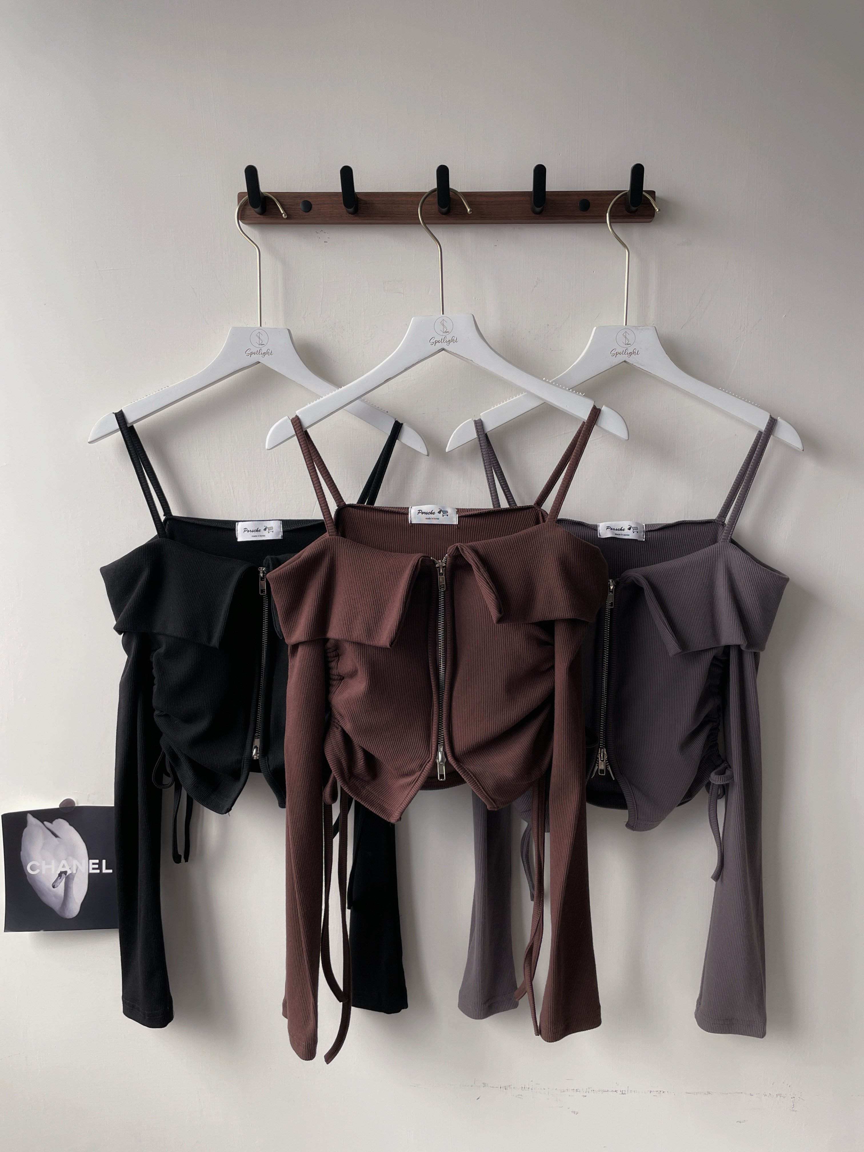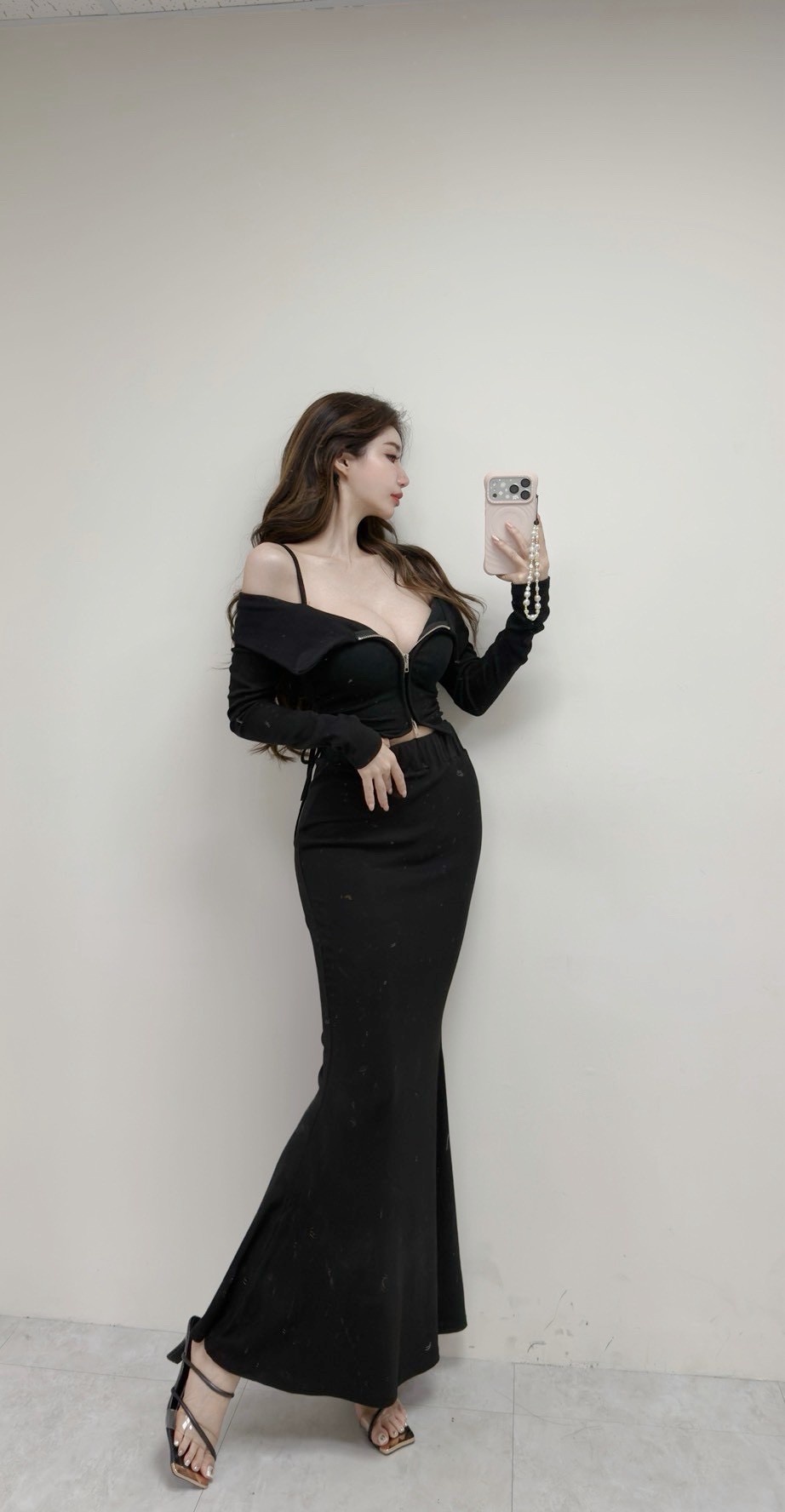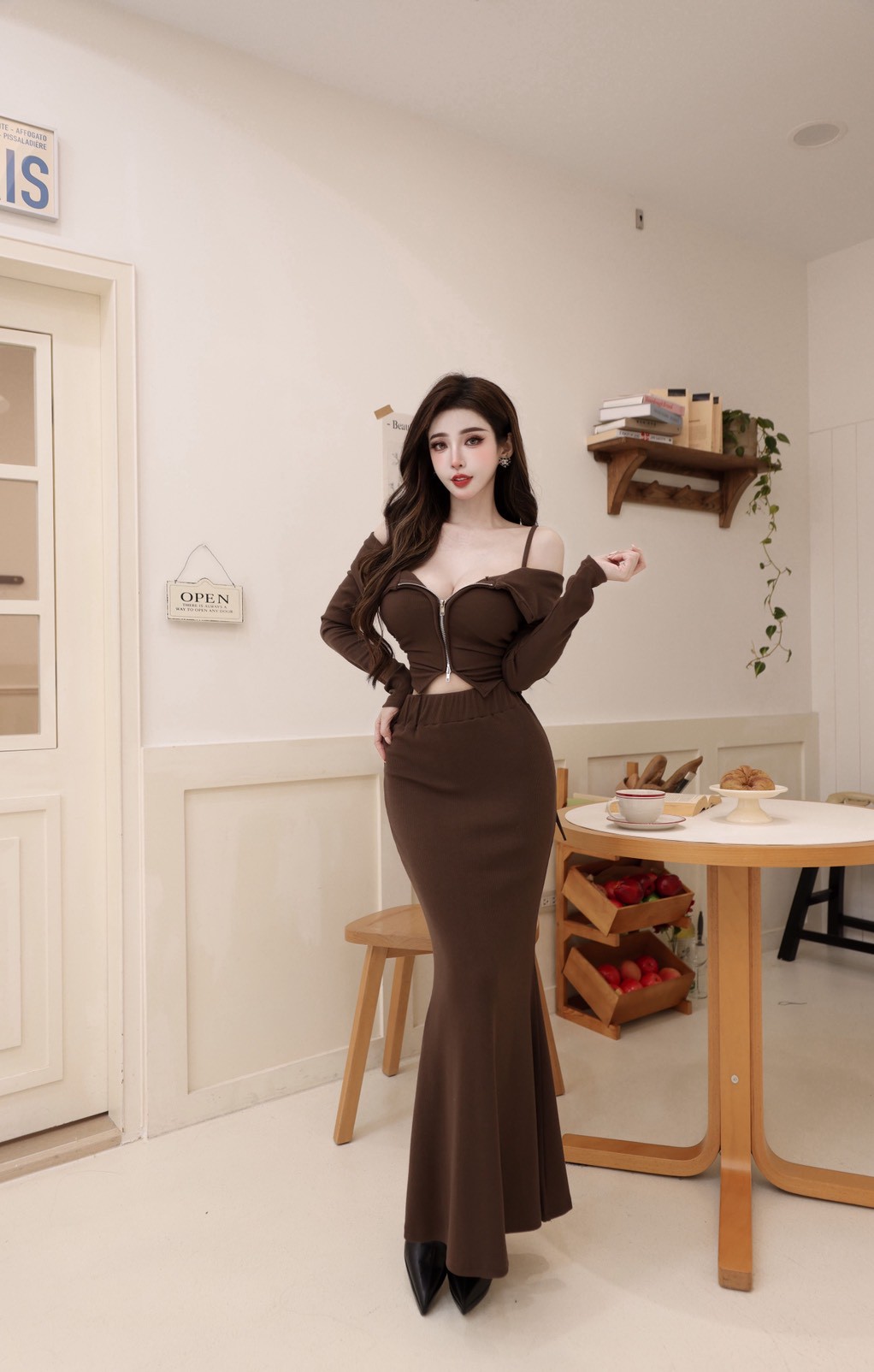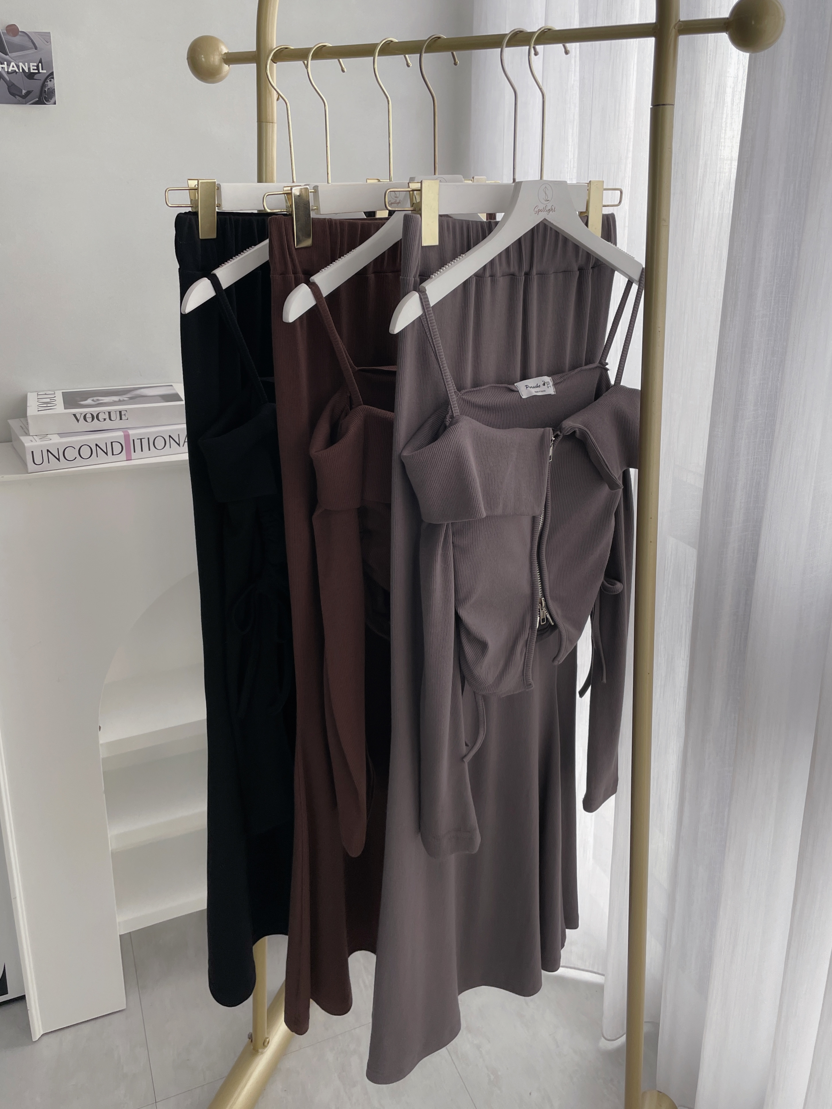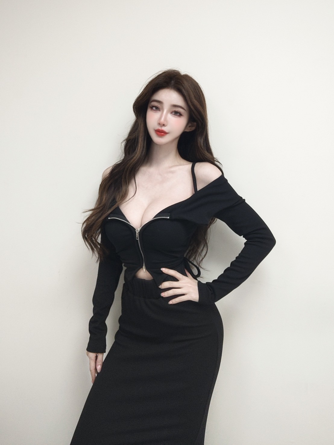 【SET】韓國羅紋一字雙拉鏈抽繩上衣+長裙