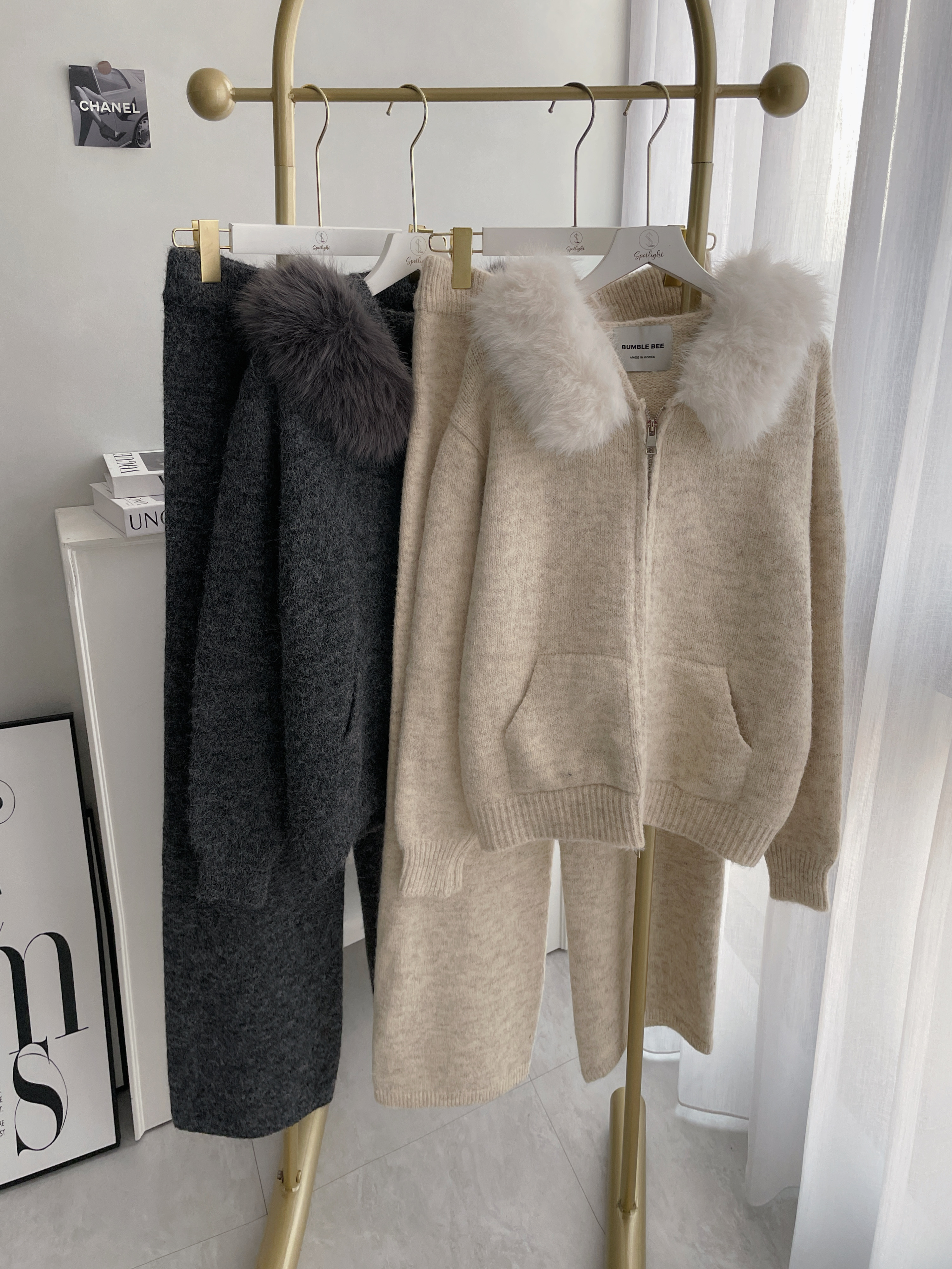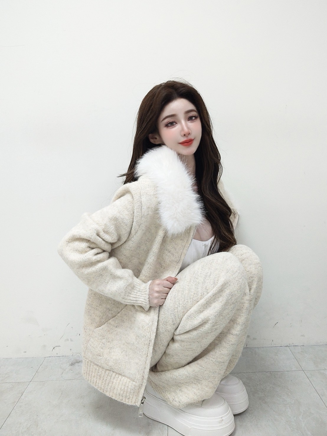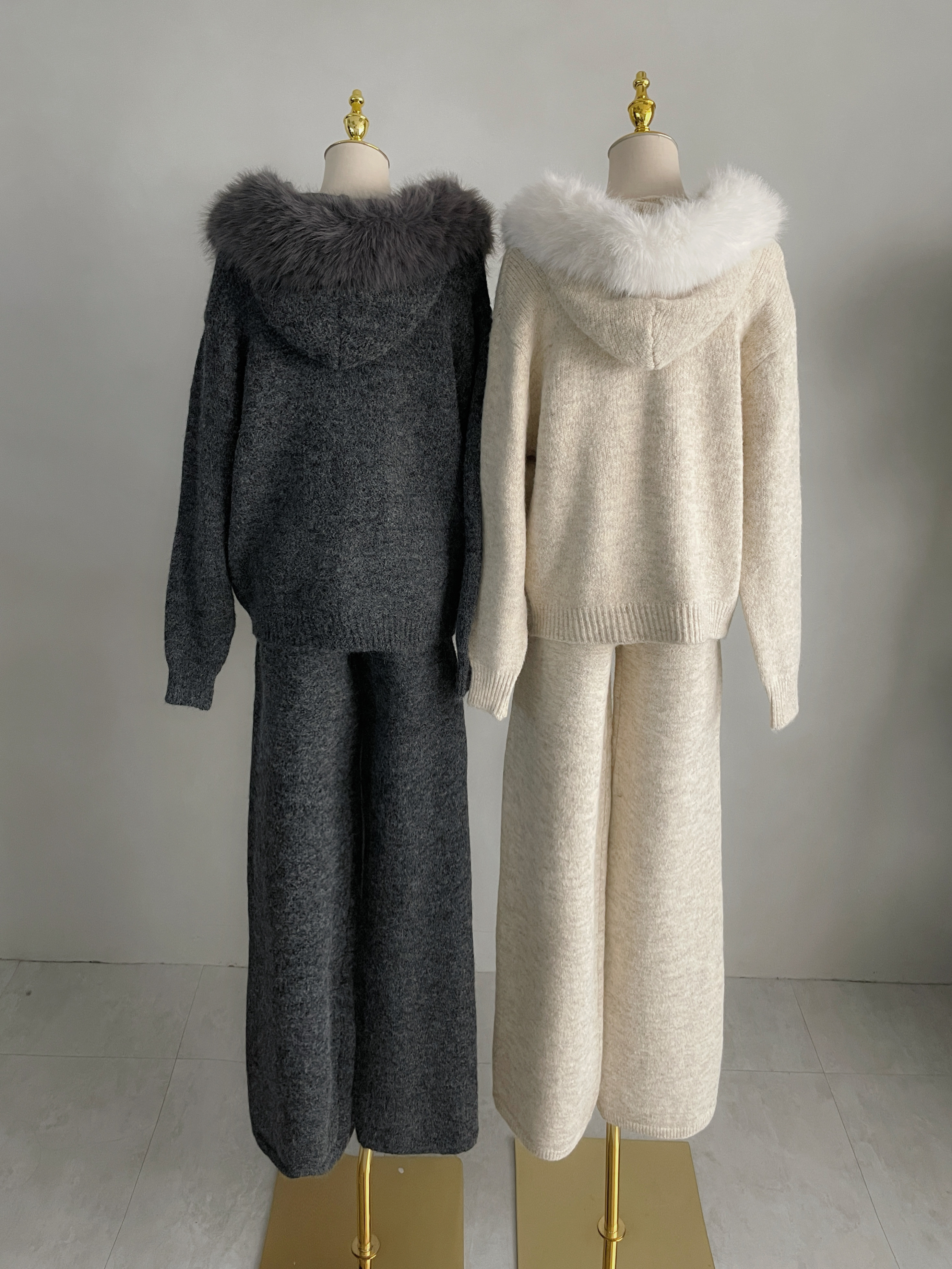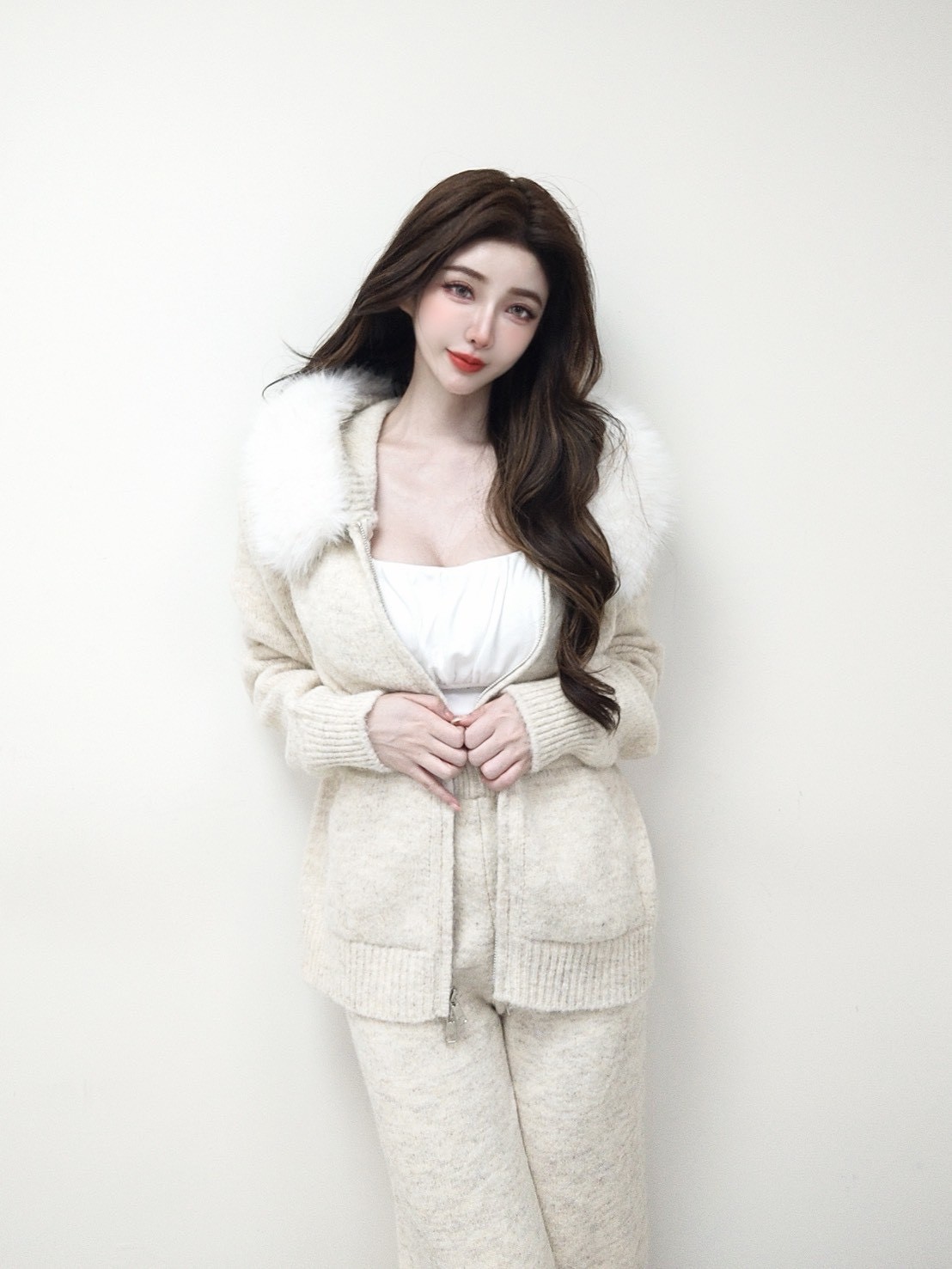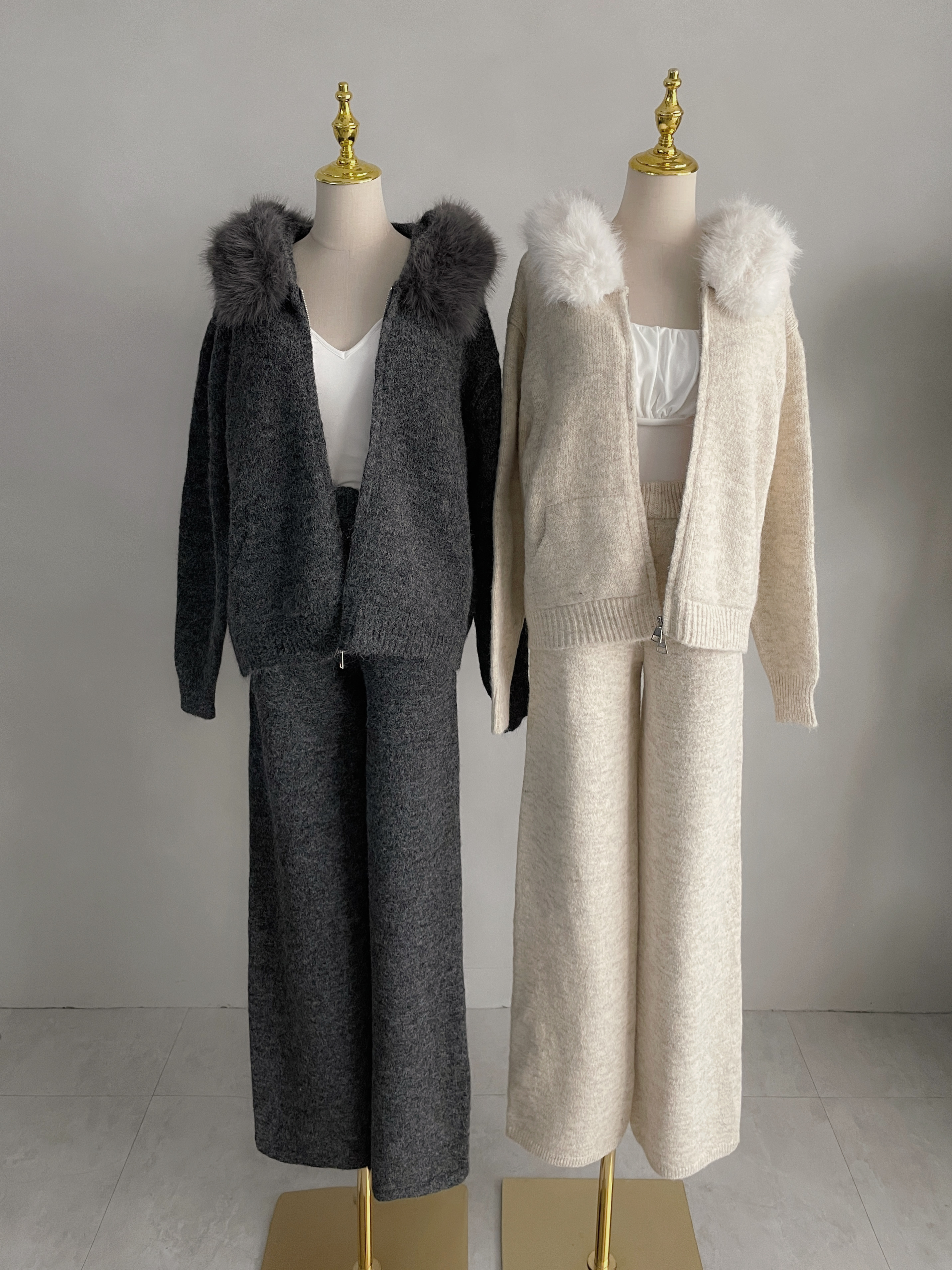 【SET】韓國羊絨毛毛領雙拉鏈外套+寬褲