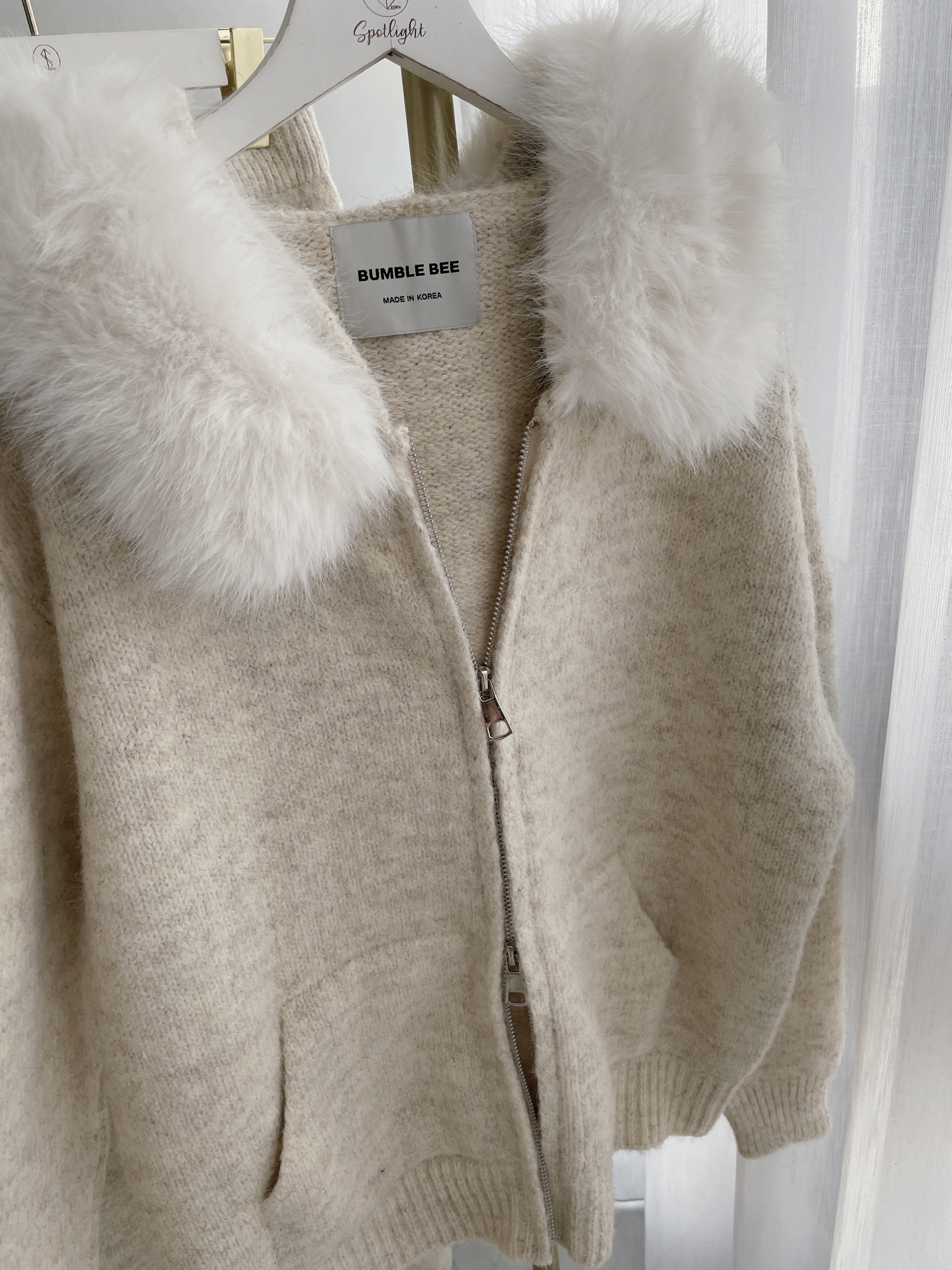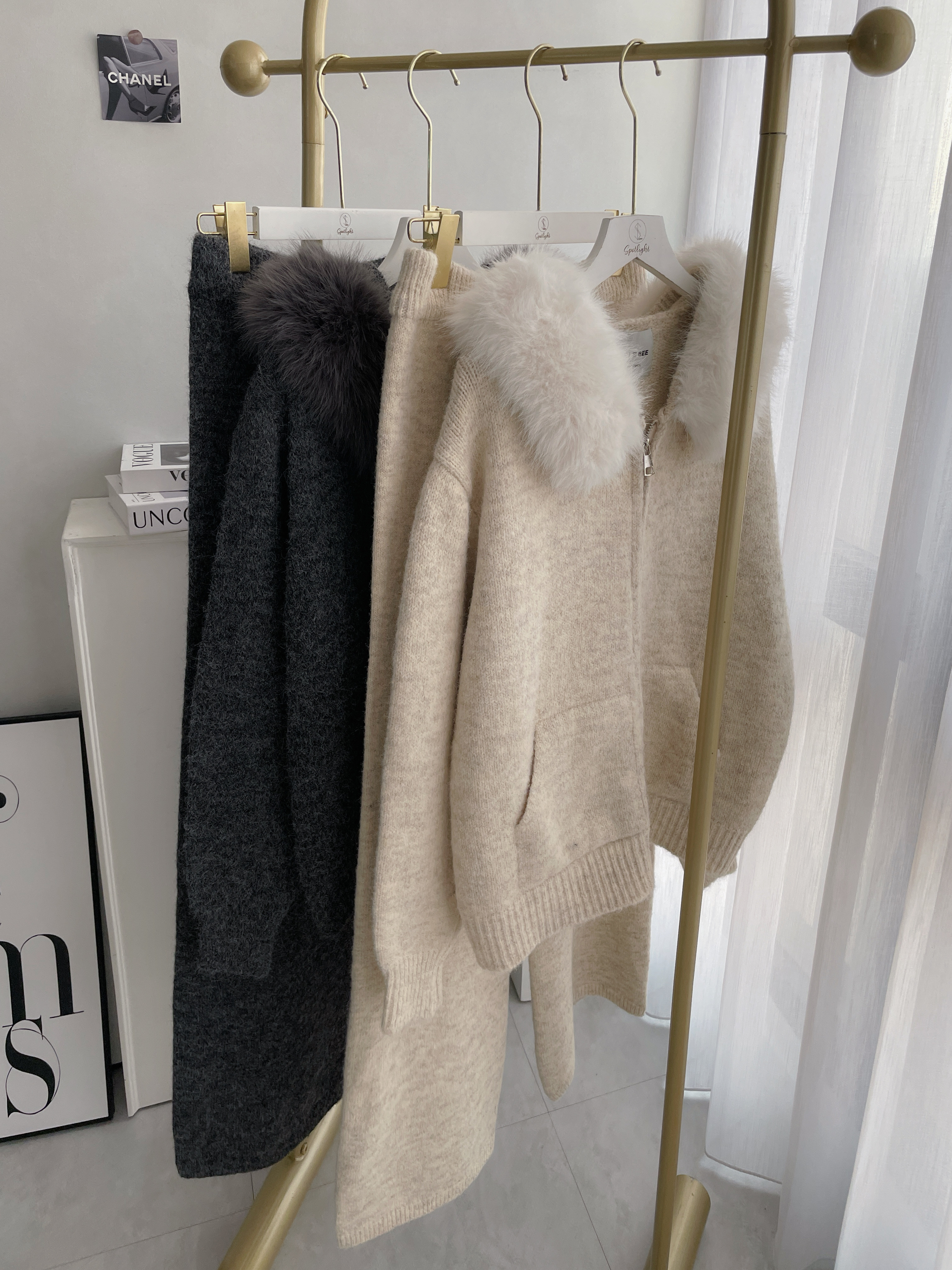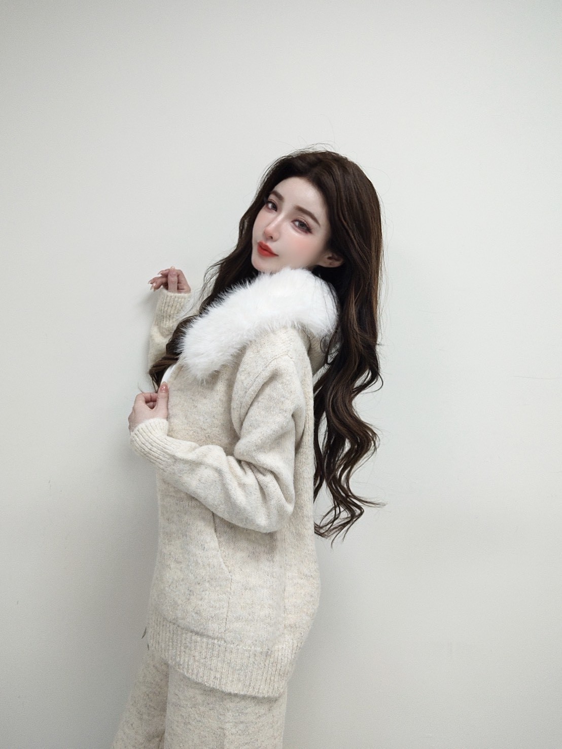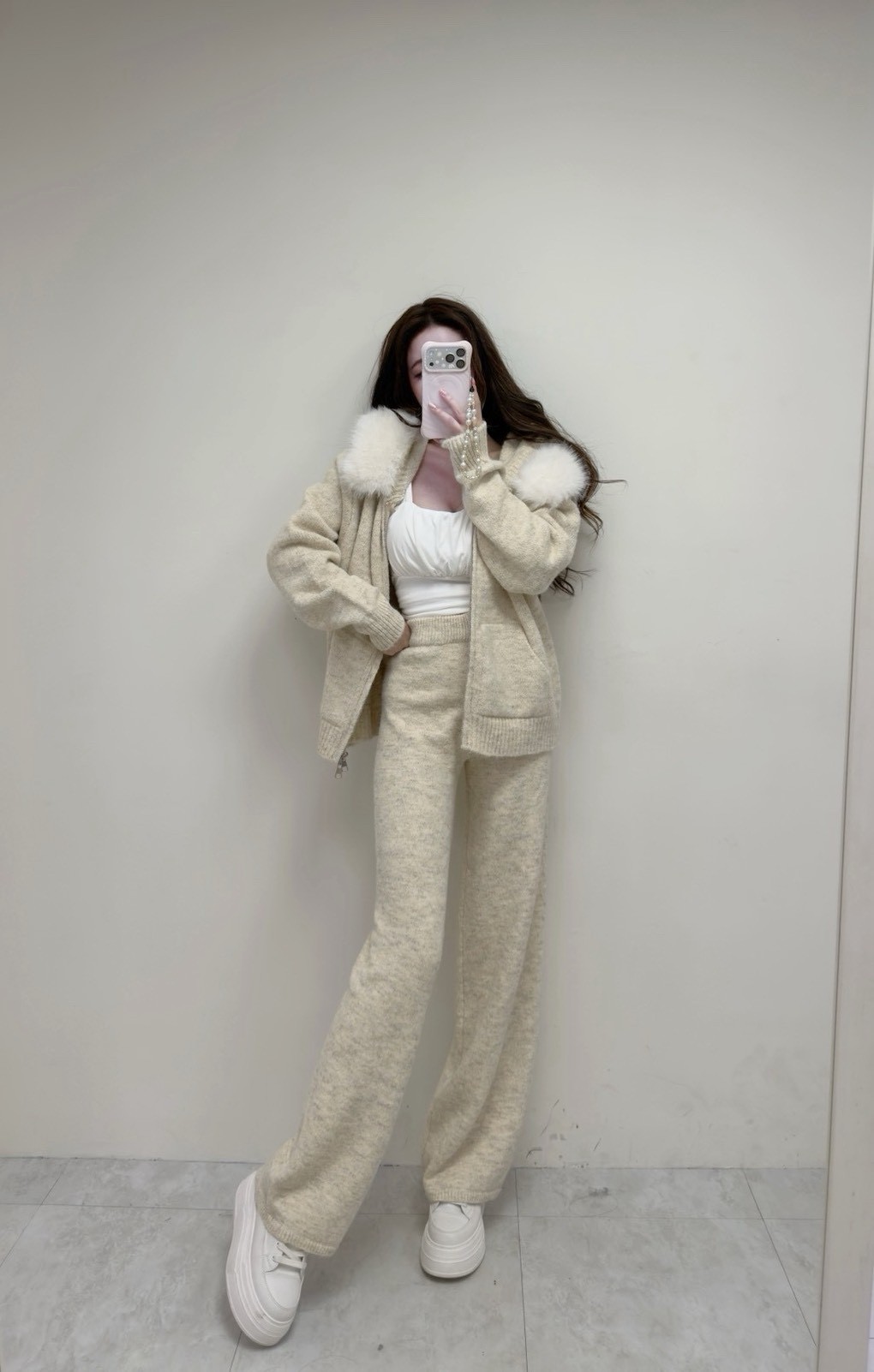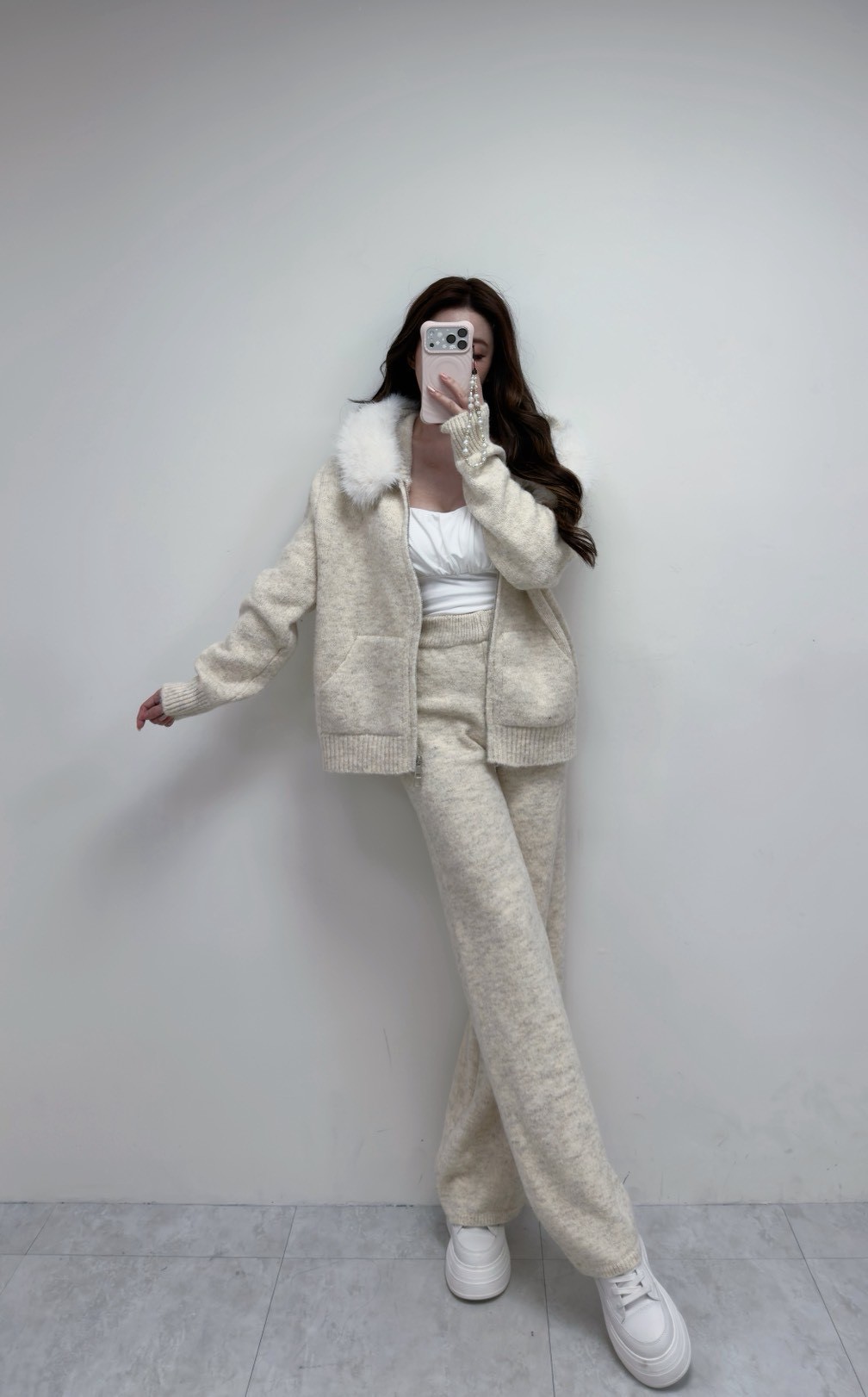 【SET】韓國羊絨毛毛領雙拉鏈外套+寬褲